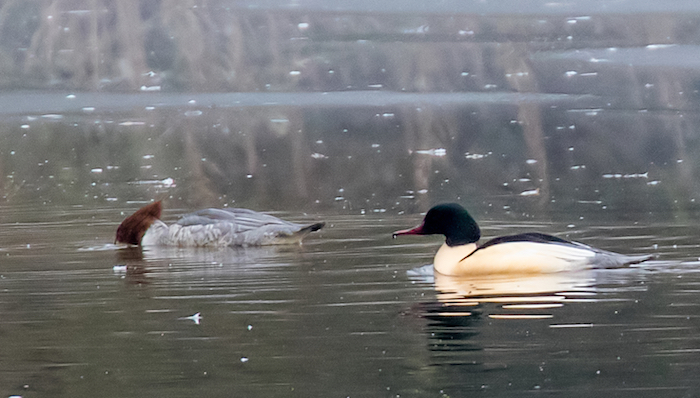 It was that same distinct, elegant duck from earlier—the male Goosander and this time there was another bird with him, presumably his mate.